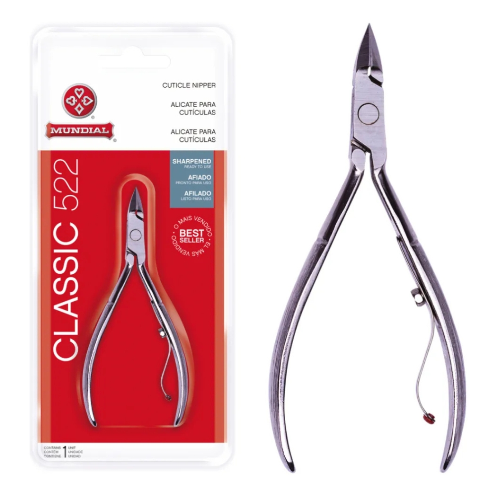 Alicate Cutícula Mundial 522 Classic Afiado Profissional possui corpo em aço carbono niquelado, garantindo uso seguro e confortável, com mola resistente para maior durabilidade. O material permite esterilização em estufa, e a afiação de fábrica prepara o produto para uso imediato.